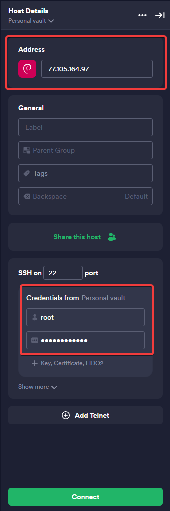 В открывшемся боковом меню заполняем обязательные 3 поля, а именно: IP, Username, Password.